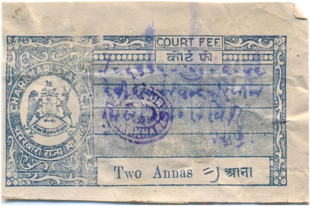 serif letters. Numeral in linear script and value in Hindi with anna/ rupees. Court Fee in