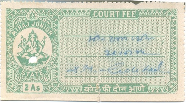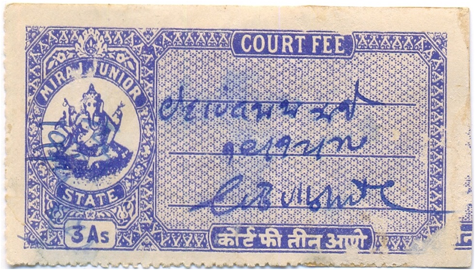 Type-6 - 1936-43 AD, Size 75 X 34 ½ mm. , Perf. 11 ½ , Wove paper, Type 5 redrawn. Letter changes in both English and Hindi . JUNIOR MIRAJ STATE over printed in bold in the center with Lord Ganesha in between.
