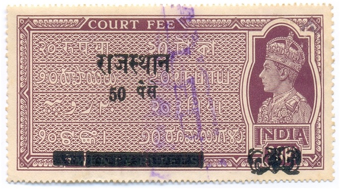 Rajasthan in Hindi and 50 Paise on 3 Rupees Court fee stamps of British India of George V